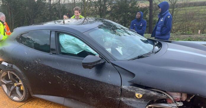 Tottenham Hotspur footballers Wilson Odobert and Randal Kolo Muani were recently in a car accident involving Muani’s vehicle and witnessed near a damaged Ferrari with the right side of the car extensively affected and the airbag deployed. Fortunately, both players emerged unharmed from the incident and are receiving assistance from mechanics attending to the damaged car.